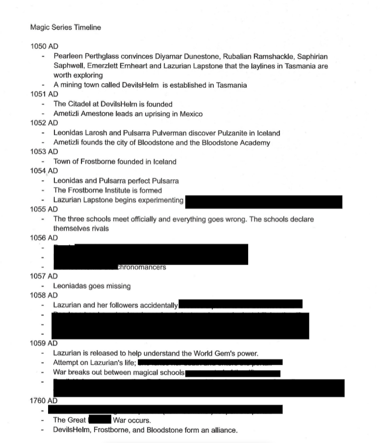 Somewhere during the process of outlining book 5, I realized oh, there's seven hundred years of history here. Secret societies. Cults. Immortals pulling strings since 1050. I had to explain the lore.